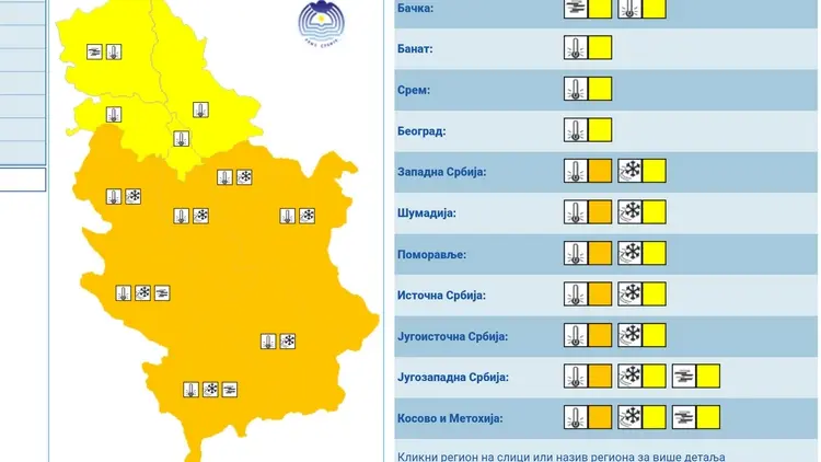 На основу упозорења које је Републички хидрометеоролошки завод упутио командантима и начелницима штабова за ванредне ситуације, у понедељак и уторак, 19. и 20. јануара 2026. године, очекују се веома ниске температуре и опасни временски услови на подручју Шумадије и већег дела Србије, због чега је проглашен наранџасти метеоаларм.