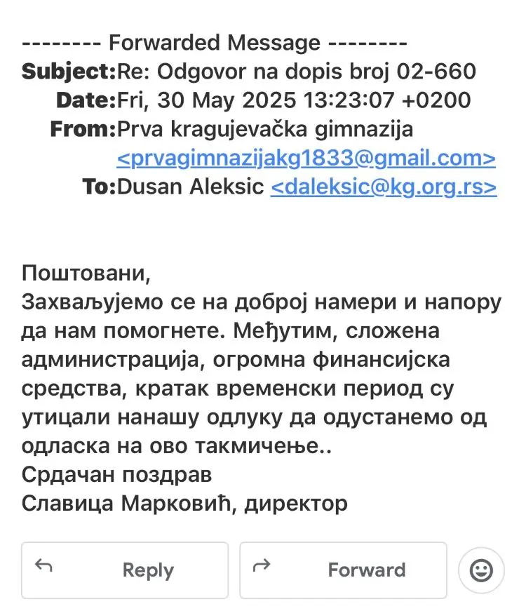 У циљу пуне транспарентности и истинитог информисања јавности, уз сагласност Прве крагујевачке гимназије, објављујем званичну кореспонденцију на ову тему.