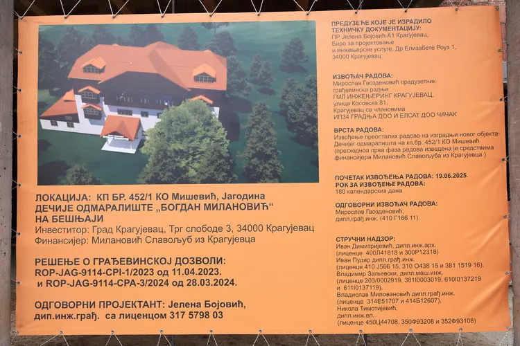 Током прошле године донацијом Славољуба Милановића урађени су груби радова на изградњи објекта а град Крагујевац се потписаним споразумом обавезао да финансира све завршне радове, који су почели данас и којима ће бити завршена изградња Дечијег одмаралишта „Богдан Милановић“ на Бешњаји, рекао је Ружић.
