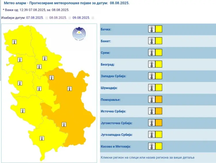 Републички хидрометеоролошки завод је издао наранџасто упозорење за петак, 8.8.2025. године за подручје Источне Србије, Југоисточне Србије и Поморавља (Борски, Зајечарски, Расински, Нишавски, Топлички, Пиротски, Јабланички, Пчињски, Поморавски, Подунавски и Браничевски управни округ) и за суботу 9.8.2025. године за подручје целе Републике Србије, на екстремно високе температуре када се очекује веома топло време са максималном температуром ≥ 35°C.