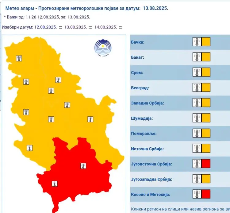 Према најавама Републичког хидрометеоролошког завода, издато је упозорење за подручје Србије на високе температуре (од среде 13.8. до недеље 17.8.2025.).Топлотни талас задржаће се до недеље (17. августа), са максималном температуром око 36°C. На снази ће бити наранџасто и црвено упозорење.