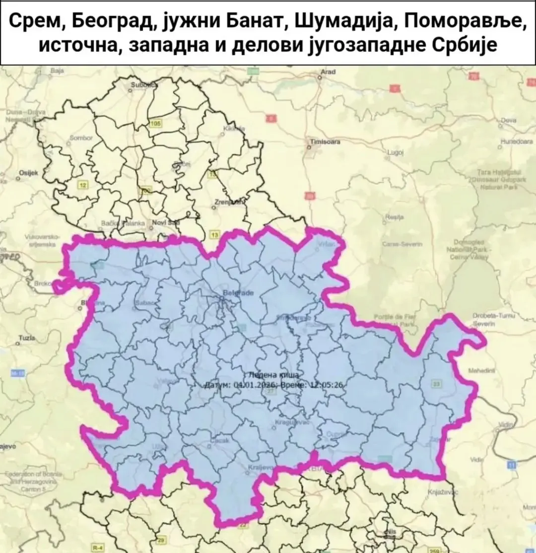 Републички хидрометеоролошки завод Србије покренуо је систем за пренос СМС хитних информација грађанима на подручју Срема, Београда, јужног Баната, Шумадије, Поморавља, источне, западне и дела југозападне Србије, због најављене појаве ледене кише у периоду од 5. до 7. јануара 2026. године.