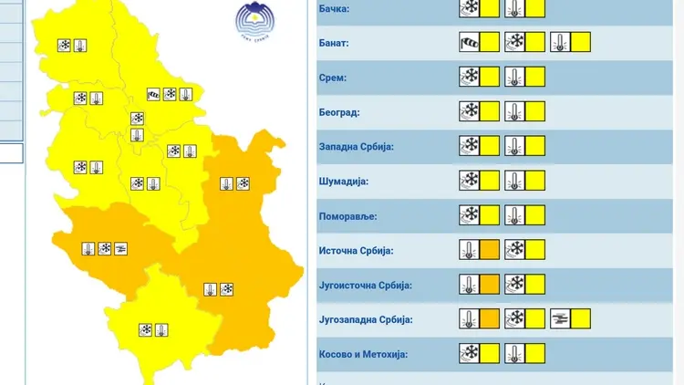 На основу упозорења које је Републички хидрометеоролошки завод упутио командантима и начелницима штабова за ванредне ситуације, у понедељак и уторак, 19. и 20. јануара 2026. године, очекују се веома ниске температуре и опасни временски услови на подручју Шумадије и већег дела Србије, због чега је проглашен наранџасти метеоаларм.