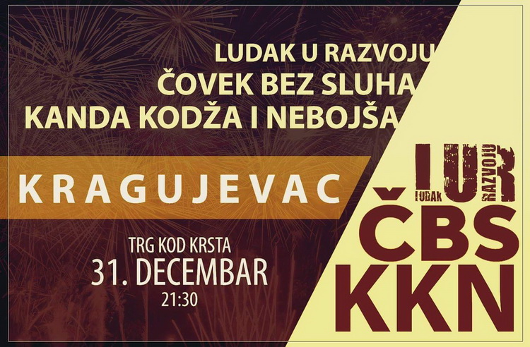 На Тргу код крста од 21.30 наступиће крагујевачки бендови ЛУР и ЧБС, који је недавно промовисао свој нови албум, а поноћ ћемо дочекати уз звуке београдског бенда „Канда, Коџа и Небојша“, који има нови сингл.