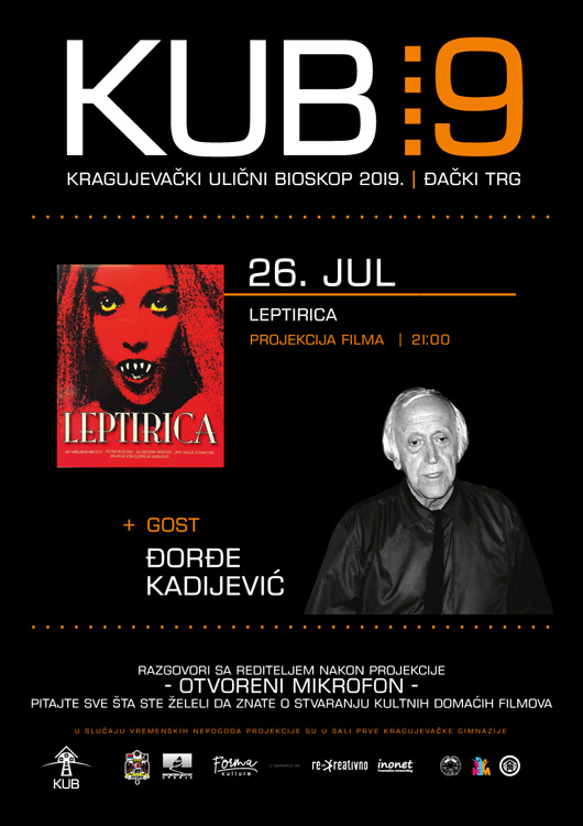 Ове године биће приказана два изузетна филма - модерни класик српске кинематографије "Лепа села, лепо горе", редитеља Срђана Драгојевића и први српски (југословенски) хорор "Лептирица", Ђорђа Кадијевића. Два бриљантна редитеља антологијских филмских остварења, који иза себе имају разноврсни опус препознатљивих наслова и још упечатљивијег редитељског манира, представиће се домаћој публици 25. и 26 јула, на Ђачком тргу испред Прве крагујевачке гимназије. Пројекције почињу у 21 сат, а како се очекује лепо време, организатори најављују две фантастичне филмске вечери.
