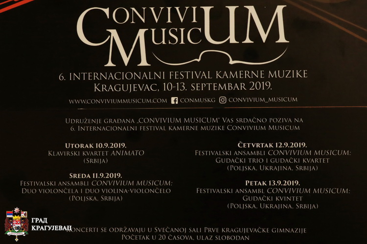 Интернационални фестивал камерне музике „Convivium Musicum“ ове ће године у Крагујевцу бити одржан од 10. до 13. септембра по шести пут и биће посвећен инструменталној „краљевској породици“ – гудачким инструментима. Током четири фестивалске вечери од 20.00 сати у Свечаној сали Прве крагујевачке гимназије наступаће млади уметници и у различтим формама се од дуа до квинтета представити делима врхунских композитора, али и оних који се ретко могу чути на овим просторима. Фестивал организује Удружење грађана „Convivium Musicum“ уз подршку града Крагујевца.