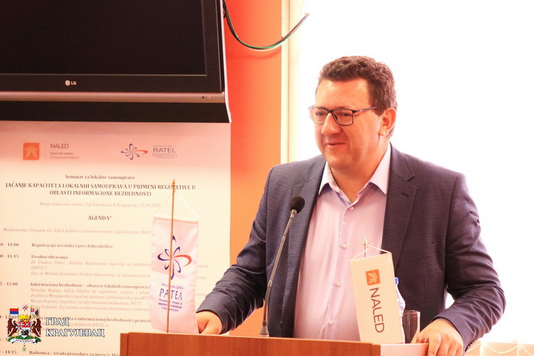 У Крагујевцу је данас у Бизнис иновационом центру одржан први од четири семинара на тему “Јачањe капацитета локалних самоуправа у примени регулативе у области информационе безбедности” намењених представницима јединица локалних самоуправа. Уз подршку Канцеларије за ИТ и еУправу Владе РС, Министарства трговине, туризма и телекомуникација семинаре на нивоу целе Србије организује Савез за еУправу НАЛЕД-а у сарадњи са РАТЕЛ-ом.