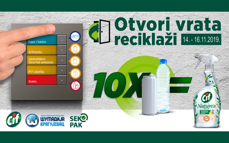 Иначе, због великог интересовања Крагујевчана продужена је и акција ОТВОРИ ВРАТА РЕЦИКЛАЖИ коју ЈКП Шумадија Крагујевац у сарадњи са компанијама Секопак и Унилевер партнерски организују. У оквиру прве фазе акције, у четвртак и петак, 14. и 15. новембра у периоду од 10 до 14 сати, тимови предузећа и компанија посетиће насеље Аеродром и за најмање 10 прикупљених лименки или ПЕТ флаша биће уручени пригодни поклони. Други део акције реализоваће се у суботу, 16. новембра од 8 до 12 часова када ће за исту количину отпада донетог у просторије Тржнице у насељу Аеродром добити Cif Nature's.