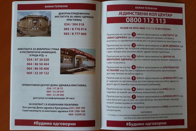 У новонасталој епидемиолошкој ситуацији Кризни штаб града Крагујевца је у сарадњи са стручњацима из Института за јавно здравље, Црвеног крста Крагујевца, подршку Дуо Дигитал Медиа и штампаријe Графостил, а у складу са препорукама Светске здравствене организације приредио водич кроз корону „Будимо одговорни“ коју ће добити 60 хиљада породица у Крагујевцу.