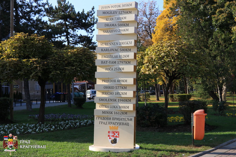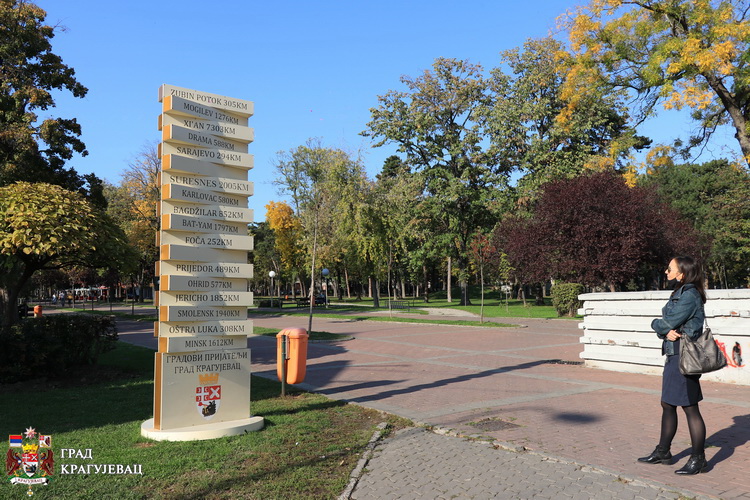 На улазу у Велики парк, једном од најпосећенијих крагујевачких шеталишта постављен је путоказ са именима градова побратима и градова и општина са којима Крагујевац има пријатељску сарадњу.