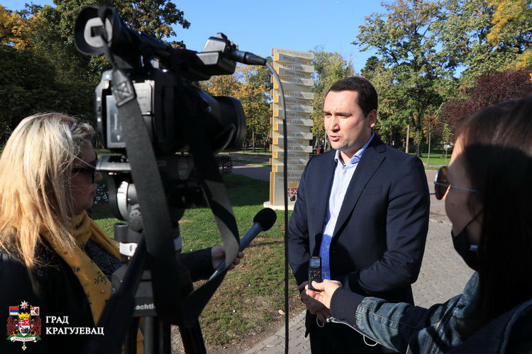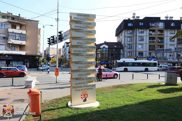 На путоказу су исписана имена и километража до градова пријатеља, градова побратима и градова са којима на основу потписане Повеље интензивно сарађујемо. На овај начин смо желели да упознамо наше суграђане а посебно младе који су то градови са којима Крагујевац сарађује. Ово је пројекат који је требало да буде завршен још прошле године али нажалост због светске пандемије Ковида-19 то нисмо успели, казао је Стефан Никезић, члан Градског већа за унапређење и заштиту животне средине.