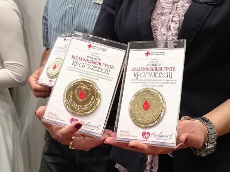 Крагујевац је шесту годином заредом добитник признања за „Најхуманији град“. Ово значајно признање којим се још једном потврђује успех у заједничким активностима локалне самоуправе, Црвеног крста Крагујевац и Службе за трансфузију Универзитетског клиничког центра на мотивацији и промоцији доборовољног давалаштва уручено је Гордани Дамњановић чланици Градског већа за здравствену и социјалну заштиту. С обзиром на то да је прошле године због пандемије корона вируса изостала традиционална свечаност, Црвени крст Србије уручио је и признања за 2019. годину. Поред Пожаревца и Пирота, по броју прикупљених јединица крви, Крагујевац је и у 2019. години освојио признање за „Најхуманију средину“.