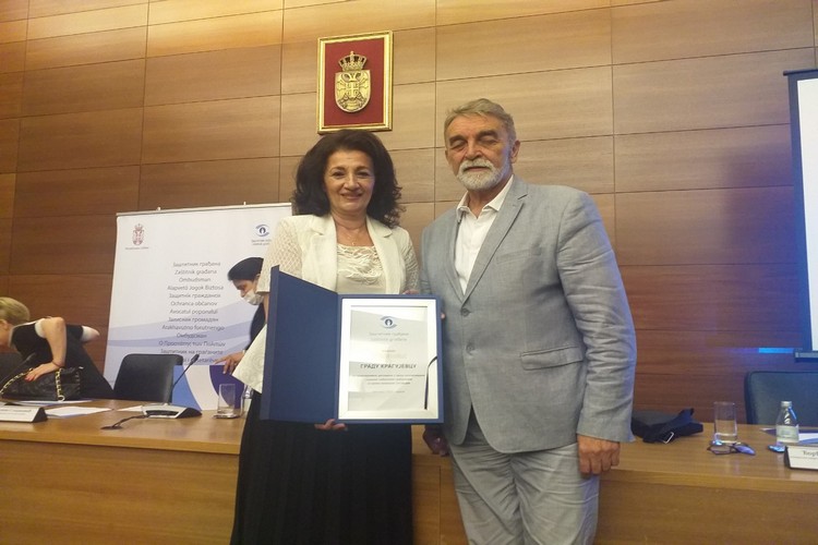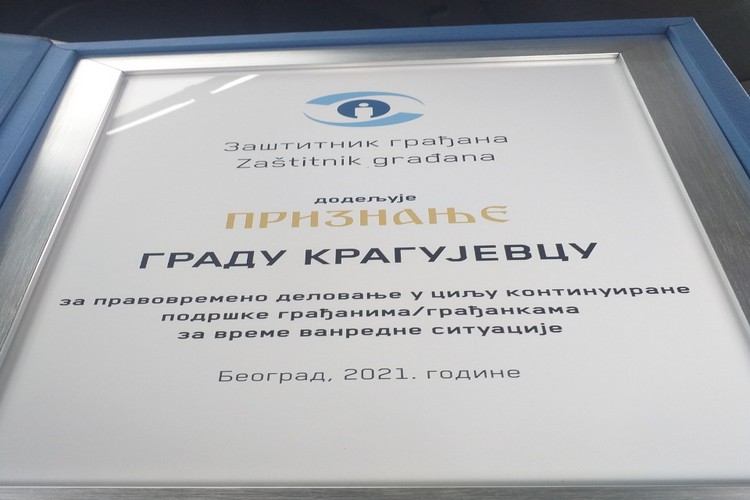 Град Крагујевац је добитник признања за правовремено деловање у циљу континуиране подршке грађанима/грађанкама за време ванредне ситуације. Реч је о награди коју додељује Заштитник грађана, у сарадњи са Тимом за социјално укључивање и смањење сиромаштва Владе Републике Србије и Сталном конференцијом градова и општина. Свечано уручење признања уприличено је данас у Београду, а у име града признање је уручено др Гордани Дамњановић, чланици Градског већа за здравствену и социјалну заштиту.