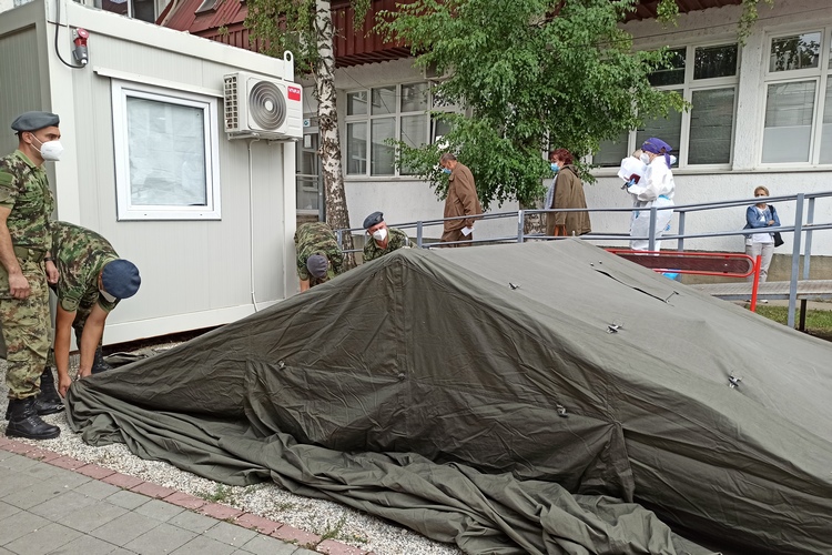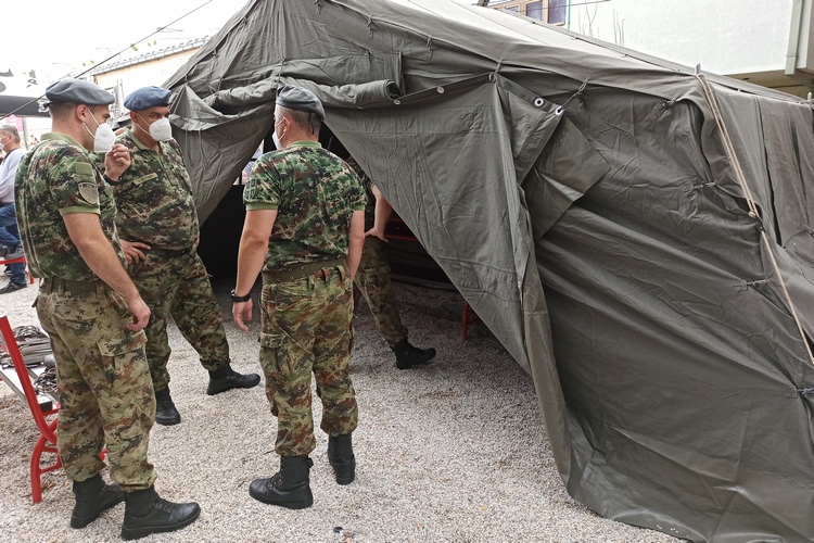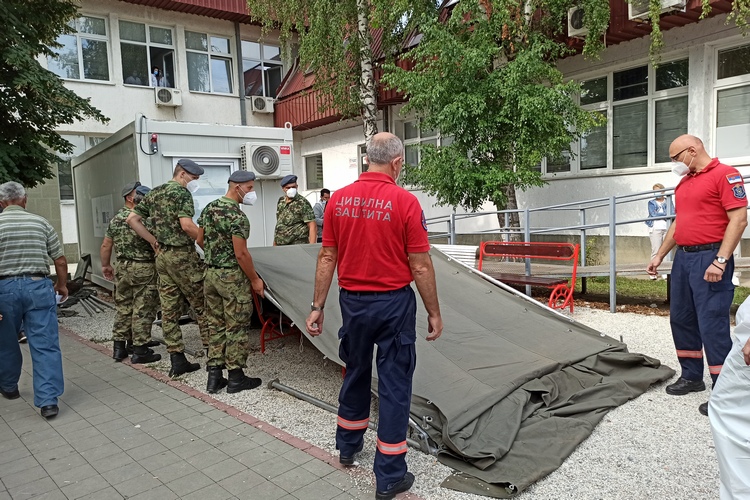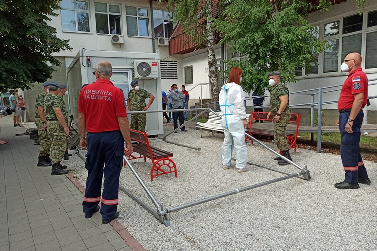 Због најављених падавина и повећаног броја прегледа, припадници Војске Србије данас су испред Ковид амбуланте у згради АТД –а где се прегледају пацијенти са фебрилним стањем и респираторним инфекцијама, поставили шаторе.