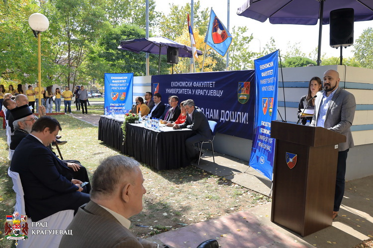 У име града бруцоше Економског факултета је поздравио председник Скупштине града Мирослав Петрашиновић и подсетио их да је ово прва лествица на путу до стицања академског звања. Петрашиновић је посебно упутио речи добродошлице студентима који су дошли у Крагујевац на студије истичући да су дошли у прву престоницу модерне Србије, данас привредни, образовни, здравствени, културни и спортски центар Шумадије. Факултет који сте одабрали, од свог оснивања дао је велики допринос у образовању компетентних економиста. Крупне промене које се збивају свуда око нас намећу нове захтеве. Нама су итекако потребни образовани млади људи који ће бити у стању да се суоче са изазовима науке и струке, рекао је председник Петрашиновић.