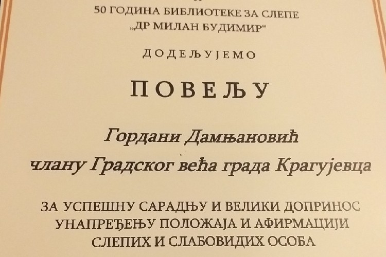 Гордана Дамањановић чланица Градског већа за здравствену и социјалну заштиту једна је од добитница повеље. Захваљујући се на признању Дамњановић је подсетила да је град Крагујевац ово признање добио пре пет година. Овај дан, један је у међународном календару, а ми се као локална самоуправа трудимо да сваког дана учинимо напоре да унапредимо положај особа са инвалидитетом, да постанемо инклузивнија средина и да бринемо о заштити од дискриминације са аспекта приступачности, образовања, здравствене и социјалне заштите на локалном нивоу.