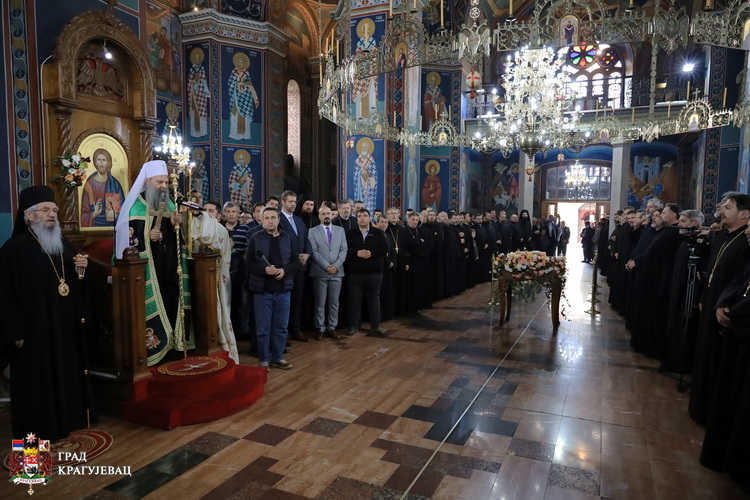 Након заједничке молитве у Саборном храму, добродошлицу патријарху српском Порфирију пожелео је епископ шумадијски Јован. Дошли сте Ваша светости као свој својима и ми Вас тако од срца примамо и дочекујемо. У овим пасхалним данима дошли сте да нас духовно окрепите и оснажите у ношењу нашег крста и у сведочењу имена Божијег. И да нас благословите. Дошли сте данас овде да се заједно помолимо Богу за мир, добро и напредак у нашој земљи, за мир у целом свету. Нека да Бог да мржња уступи место љубави, да у целом свету процвета љубав без сенке, нада без поклекнућа, а вера без сумње.