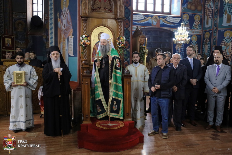 Велику духовну радост у Шумадијској епархији поводом посете Његове светости патријарха српског Порфирија најпре су обзнанила звона са Саборне цркве. Патријарха је у порти храма дочекао Његово преосвештенство епископ шумадијски Јован, свештенство, монаштво, верници и градоначелник Крагујевца Никола Дашић са сарадницима.