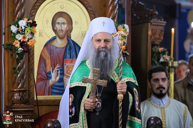 Моја је радост велика што се данас налазим у Крагујевцу, у срцу Шумадије. Иако нисам први пут овде, увек сам био испуњен благословом Божијим и знао читавим својим бићем да сам међу браћом и сестрама, казао је патријарх српски Порфирије. Радујемо се сви заједно, јер је време истинске радости. Радост и одсуство страха јесу нешто што нам је потребно јер су страх и туга данас постали доминантна осећања и доминантна атмосфера у којој живи човек, који је сав по својој палој природи у расцепу, подељен, нестабилан, флуидан, променљив. А ово је време поруке Христове и време дара његовог у којем не само да знамо до смо за све друго саздани и да у нама постоји потенцијала и могућности да то остваримо у својим животима, него су радост и одуство страха постала наша осећања, наше емоције, наше мисли, наше свеукупно стање у ове свете дане. Јер Господ је дошао међу нас, а циљ његовог доласка јесте да би победио смрт, грех и ђавола јер ту лежи извор туге, несигурности и страха, поручио је патријарх српски Порфирије.