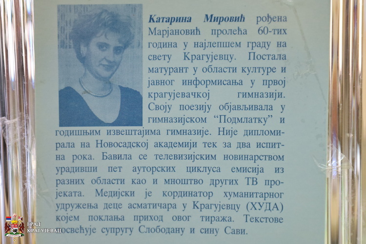 У Првој крагујевачкој гимназији, у присуству породице, пријатеља, колега и сарадника, данас је почела једномесечна манифестација Дани Катарине Каће Мировић „Суграђани стварају срцем“ посвећена новинарки Радио телевизије Крагујевац која је прошле године преминула од последица Ковида-19.