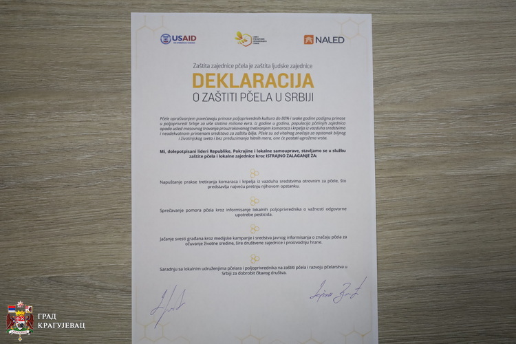 Град Крагујевац као потписник Декларације о заштити пчела у Србији, укључио се у процес заштите пчела као угрожене врсте проглашене од стране Европске Уније. Декларацију су потписали Дамјан Срејић, члан Градског већа за равномерни и одрживи развој села и града и Дејан Ђокић, председник Друштва пчелара Крагујевац. Потписивању је присуствовао и Слободан Ломовић, саветник у Одељењу за пољопривреду, рурални развој и робне резерве.