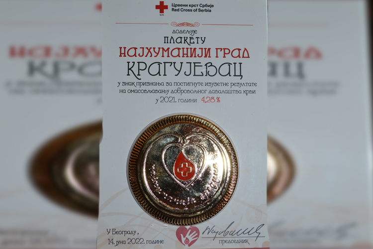 Наш град се, захваљући високом степену хуманости наших суграђана, може похвалити да 4,28 посто становника доборовољно даје крв. Имајући у виду да је према светским стандардима за довољне залихе крви неопходно 4 посто добровољних давалаца, на тај начин обезбеђене су довољне количине крви за све који се током године лече у Универзитетском Клиничком центру у Крагујевцу.