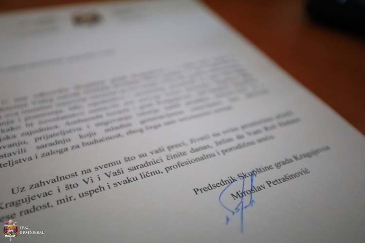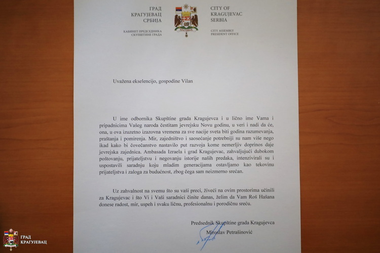 У име одборника Скупштине града Крагујевца и у лично име Вама и припадницима Вашег народа честитам јеврејску Нову годину, у вери и нади да ће, она, у ова изузетно изазовна времена за све нације света бити година разумевања, праштања и помирења. Мир, заједништво и саосећање потребнији су нам више него икад како би човечанство наставило пут развоја коме немерљив допринос даје јеврејска заједница. Амбасада Израела и град Крагујевац, захваљујући дубоком поштовању, пријатељству и неговању историје наших предака, интензивирали су и успоставили сарадњу коју младим генерацијама остављамо као тековину пријатељства и залога за будућност, због чега сам неизмерно срећан.