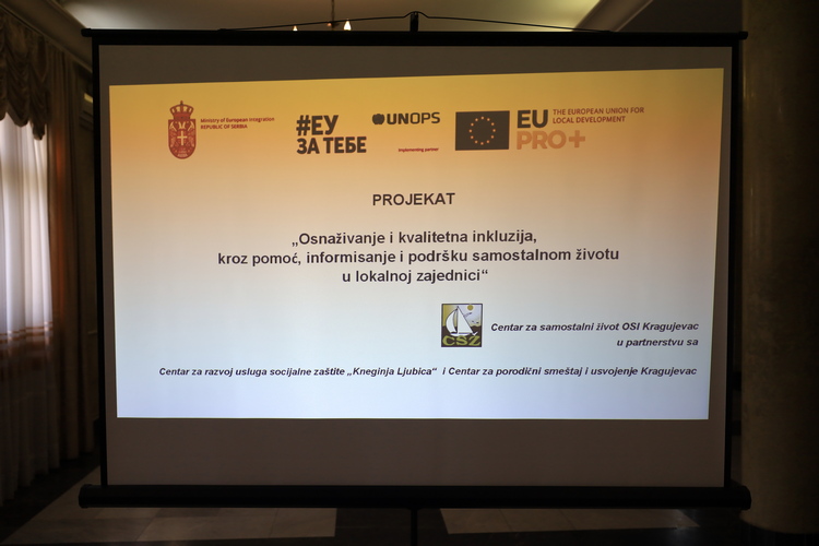 Пројекат ''Оснаживање и квалитетна инклузија кроз помоћ, информисање и подршку самосталном животу у локалној заједници'' за циљ има повећање квалитета и видљивости услуга социјалне заштите које се пружају особама са инвалидитетом на локалном нивоу посебно у ванредним ситуацијама, рекла је др Милена Стојановић, председница Центра за самостални живот ОСИ на презентацији почетка реализације пројекта који се реализује у оквиру Програма Европске уније за локални развој – ЕУ ПРО Плус, спроводи Канцеларија Уједињених нација за пројектне услуге (УНОПС) у Србији, уз финансијску подршку Европске уније, а у Крагујевцу реализује Центар за самостални живот ОСИ у партнерству са Центром за развој услуга социјалне заштите „Кнегиња Љубица“ и Центром за породични смештај и усвојење. Специфични циљеви, казала је др Стојановић јесу пилотирање услуге предах хранитељство у циљу збрињавања деце са сметњама у развоју и младих са инвалидитетом, затим унапређење подршке помоћ у кући и обезбеђивање подршке мобилног тима за одрасле и старе ОСИ, оснаживање младих ОСИ за самосталан живот у локалној заједници.