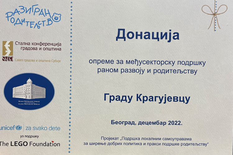 На 6. Националној конференцији о раном развоју и родитељству ''Навијамо за родитеље'' у оквиру активности пројекта, Граду Крагујевцу су донирани дечији намештај и дидактичка средства у сврху унапређења подршке родитељству и раном развоју деце. У име града уговор и опрема уручени су Душану Алексићу, члану Градског већа за образовање.
