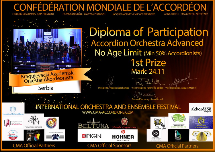 Крагујевачки академски оркестар акордеониста ради под окриљем Музичког центра Крагујевац и окупља уметнике које повезује неговање академског звука хармонике. На Светском трофеју свирали су дела Артура Маркеза и Астора Пијацоле. Такмичили су се у „Д“ категорији у којој не постоје старосне границе за чланове оркестара и у оквиру које је поткатегорија „напредни ниво“ за коју су се пријавили. Послали су видео материјал у трајању од 30 минута са својих концерата у Новосадској синагоги и Коларчевој задужбини у Београду. Освојили су прву награду, а новац од награде донирали Клиници за педијатрију УКЦ Крагујевац.