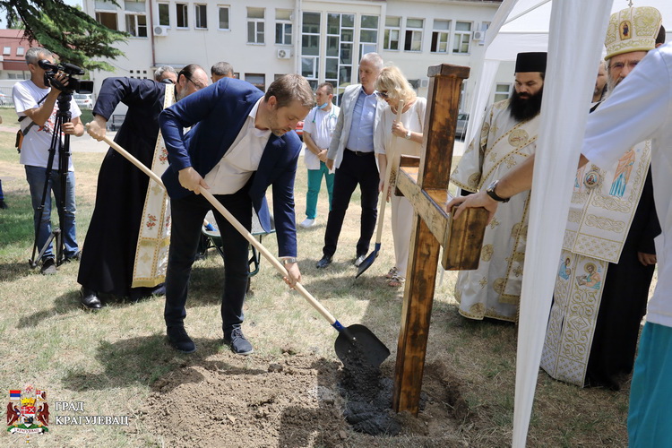 Након званичног пуштања у рад скенера и ангио сале, у кругу Универзитетског клиничког центра, Његово преосвештенство епископ шумадијски Јован уз саслужење свештенства Епархије шумадијске обавио је освећење камена темељца прве цркве у историји у кругу те здравствене установе.