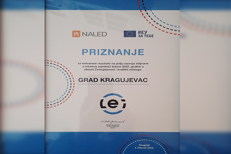 Град Крагујевац један је од добитника НАЛЕД – овог признања за развој еУправе у локалној заједници током 2022. године у области Заступљеност и квалитет еУслуга. Признања су уручена у Београду на завршнoј конференцији пројекта „Успостављање индекса еУправе (ЛЕИ) за јединице локалних самоуправа у Републици Србији“.