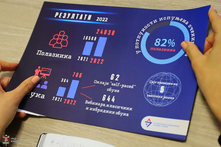 Данас су са нама представници Националне академије за јавну управу зато што је Крагујевац постигао значајне резултате у области стручног усавршавања Поредили смо резултате од 2020 – 2022. године и уочили да су прошлогодишњи резултати више него дупло бољи, како у броју полазника обука тако и у броју сертификата и примене знања. Наравно да увек има простора за нове едукације, за нова учења, јер је процес учења доживотан. На састанку је било речи и о будућој сарадњи. Већ наредне недеље ћемо одржати обуку за све службенике који имају директан контакт са грађанима како бисмо подигли ниво сарадње са грађанима – каже Сања Туцаковић, члан Градског већа за локалну самоуправу.
