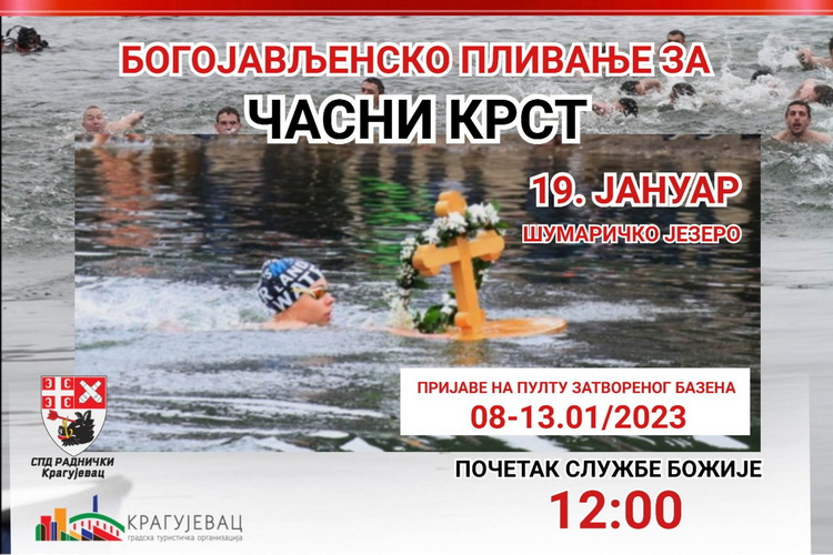Шумадијска епархија, Град Крагујевац, Градска туристичка организација и Спортско привредно друштво Раднички, обавештавaју све заинтересоване суграђане који 19. јануара, на Богојављење желе да пливају за Часни крст, да ће пријављивање почети у недељу, 8. јануара и трајаће до 13. јануара, на пулту затвореног базена, од 7 до 22 сата. Од ове године број учеснике није ограничен. За малолетне учеснике, уз благослов свештеника, потребна је и оверена сагласност родитеља.