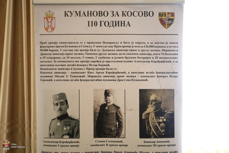 Велико је задовољство што је Крагујевац један од градова у коме се обележава 110 година од Кумановске битке, једне од најзначајнијих битака у историји српског народа. Велика победа код Куманова била је прва српска победа у Првом балканском рату и означила је скори крај турске владавине на Балкану, рекао је Мирослав Петрашиновић, председник Скупштине града. Србију данас не бранимо војном стратегијом и неустрашивим јуришима, већ нашу земљу чувамо у миру, мудром политиком државног врха, јер губитке и нове жртве не желимо, а да се сећамо догађаја, борби и јунака наше историје који су нам данашњи мир и слободу донели морамо и то је наша обавеза и одговорност према будућим генерацијама, истакао је Петрашиновић.