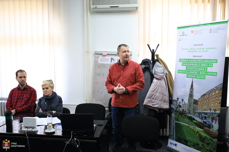 У оквиру програма Зелени, резилијентни градови удобни за живот који у Србији реализује Светска банка, Швајцарска конфедерација и Министарство грађевинарства, саобраћаја и инфраструктуре кроз пројекат “Јачање капацитета локалних самоуправа у Србији ка инвестицијама у нискоугљенични и резилијентни урбани развој“, у Крагујевцу је одржана прва радионица и размена искустава ’’ГИС, базе података, урбана мобилност и управљање ризицима’’.