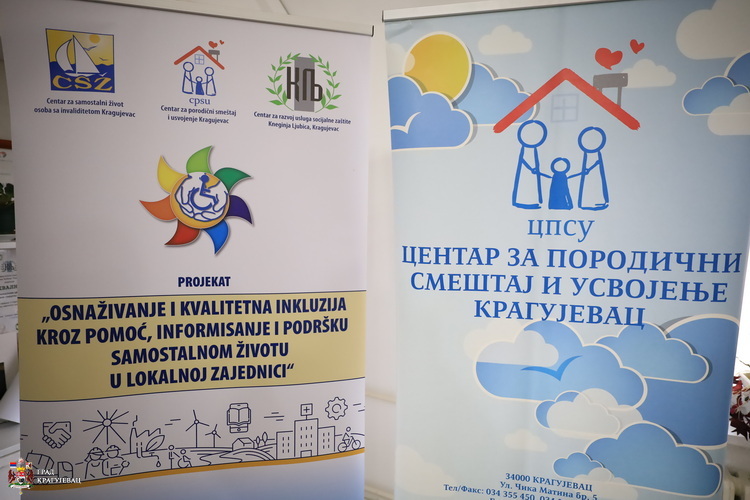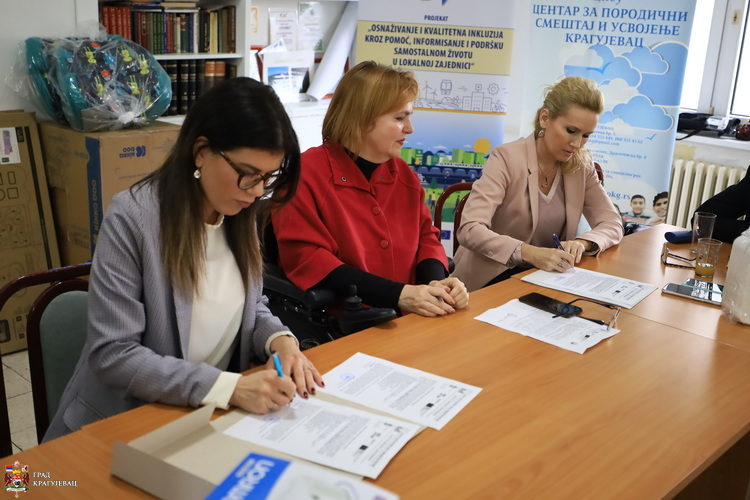 У оквиру пројекта "Оснаживање и квалитетна инклузија, кроз помоћ, информисање и подршку самосталном животу у локалној заједници" који реализује Центар за самостални живот ОСИ Крагујевац, партнерима на пројекту Центру за развој услуга социјалне заштите „Кнегиња Љубица“ и Центру за породични смештај и усвојење Крагујевац уручена је опрема. Тим поводом са др Миленом Стојановић, председницом Центра за самостални живот ОСИ, директорке партнерских институција, Ана Милетић Вучковић и Славица Новаковић, потписале су уговоре о примопредаји.