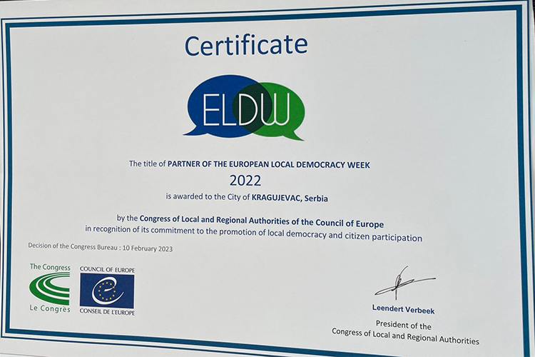 Град Крагујевац добитник је признања „Партнер Европске недеље локалне демократије 2022“ које је у Стразбуру на годишњем координационом састанку у Палати Европе уручено Зорану Младеновићу, заменику председника Скупштине града.