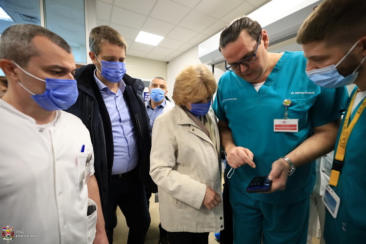 Министарка Даница Грујичић је своју посету УКЦ Крагујевац започела присуством јутарњем колегијуму ове установе где се детаљно упознала са менаџментом установе, плановима и проблемима са којима се сусрећу, пре свега кадровским и потребом за набавком опреме.