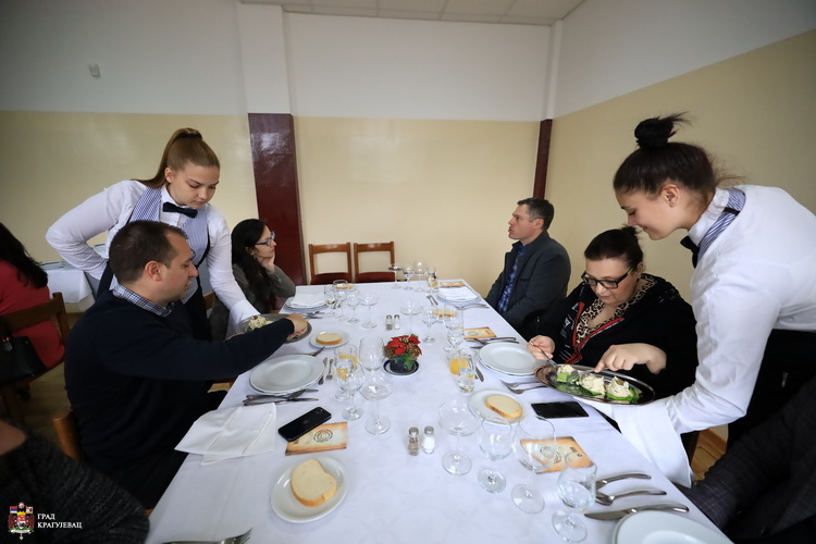 У оквиру припрема за републичко такмичење трговинско угоститељских школа Србије коме ће Крагујевац бити домаћин 27. и 28. априла, ученици крагујевачке школе данас су за представнике града Крагујевца, јавних и образовних институција у просторијама школе приредили банкет, што ће бити једна од пет такмичарских дисциплина.