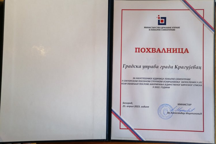 Градска управа града Крагујевца добила је похвалу од Министарства за државну управу и локалну самоуправу за најуспешнију јединицу локалне самоуправе у секторском посебном стручном усавршавању запослених у јединицма локалне самоуправе који обављају послове ажурирања Јединственог бирачког списка у 2022. години.