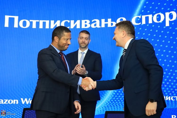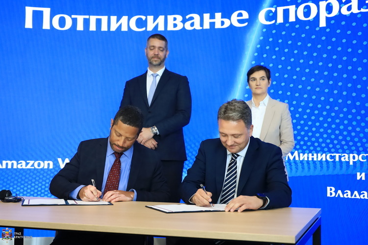 У присуству председнице Владе РС, Ане Брнабић, градоначелника Крагујевца Николе Дашића и званичника, у Државном дата центру, министар информисања и телекомуникација у Влади Републике Србије, Михаило Јовановић и генерални менаџер Аmazon Web Services (AWS) за Европу, Камерон Брукс, потписали су данас Меморандум о разумевању.