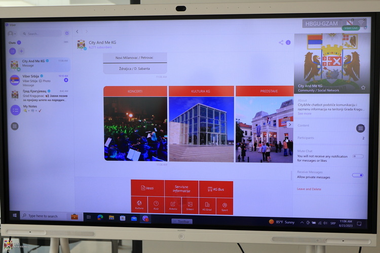 Viber Chatbot сервис града Крагујевца је само још један корак у унапређењу рада локалне самоуправе односно транспарентности рада и комуникације са грађанима. Реч је о интерактивном сервису инкорпорираном у једној од најзаступљенијих комуникационих платформи у Србији, Viberu, путем којег грађани на најбржи могући начин могу доћи до жељених информација, каже Сања Туцаковић, чланица Градског већа за локлану самоуправу. На располагању је девет менија са актуелним сервисним инфомацијама, информацијама из културе, спорта, а директно се приступа и званичном сајту града и сајту културакг, спроводе се анкете, квизови за грађане. Посебно су интересантни бесплатни интерактвини стикери са мотивима и обележјима Крагујевца чијим се преузимањем аутоматски приступа вибер групи. Туцаковић је истакла да је пре десет дана на апликацији било 60 корисника а увођењем стикера уз помоћ и подршку Vibera, број корисника је порастао на нешто више од шест хиљада. Преузимање стикера је најбржи начин за приступање апликацији поред позива у групу из контаката са телефонског именика. Очекујем да ће сервис врло брзо достићи свој максимум и грађани ће на најбржи могући начин доћи до најновијих информација, рекла је чланица Градског већа. Она је подсетила да је пршле године постављен нови званични сајт града и сајт култураКг. Град Крагујевац је и добитник награде за најбољу локалну самоуоправу од стране СКГО за софтверску апликацију eKGgrađanin за пријављивање проблема, предлога и сугестија као и за апликацију лична карта месних заједница где су смештени сви подаци о месним заједницама, казала је Туцаковић.