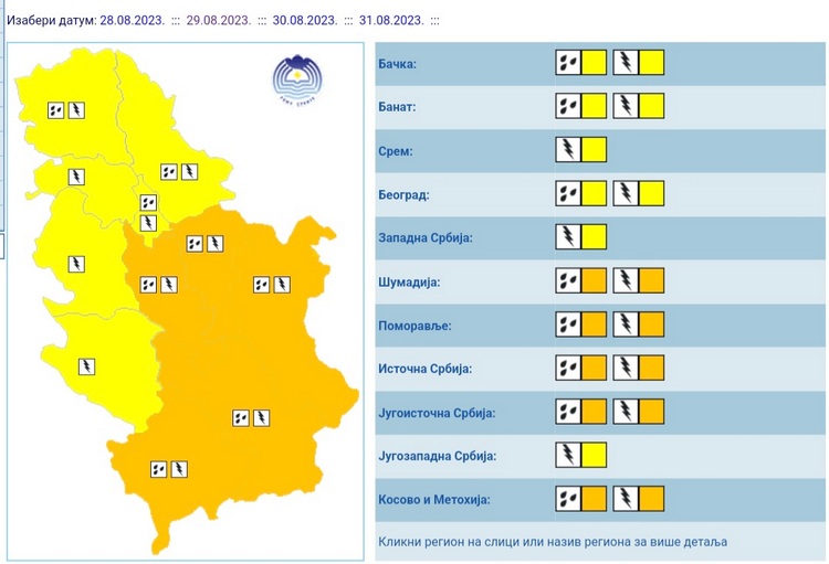Пљускови и грмљавина који се очекују на подручју Србије, локално ће бити интензивнији (од 20 до 40 мм за кратко време), уз град и олујни ветар са већом вероватноћом појаве после подне и увече у јужним, централним и источним крајевима земље.