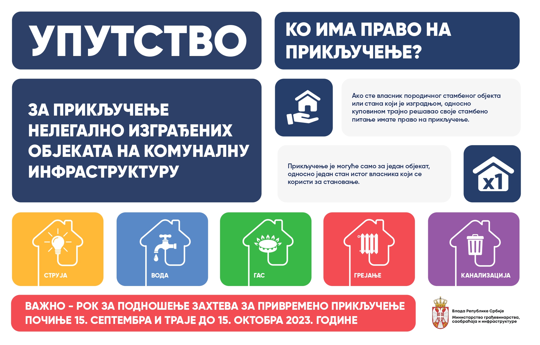 Од 15. септембра почиње пријем захтева за привремено прикључење на електроенергетску мрежу, гасну мрежу и/или мрежу даљинског грејања, водовод и канализацију незаконито изграђених објеката.