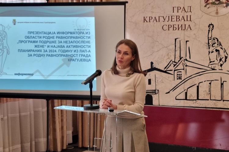 Информатор из области родне равноправности „Програми подршке за незапослене жене“ представљен је данас у присуству Томислава Жигманова, министра за људска и мањинска права и друштвени дијалог и Бранкице Јанковић, поверенице за заштиту равноправности. Презентацији су присуствовали и Мирослав Петрашиновић и Ивица Самаиловић, чланови Привременог органа града Крагујевца, Гордана Дамњановић, члан Комисије Привременог органа града Крагујевца и Јелена Миливојевић, омбудсман града Крагујевца.