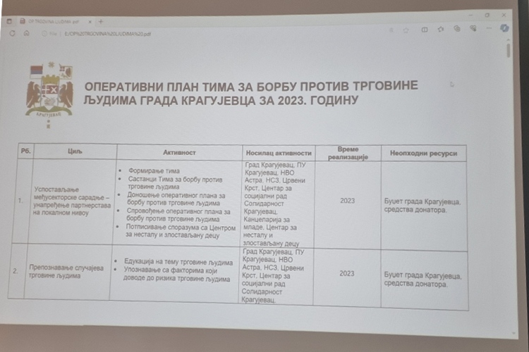Унапређење Оперативног плана тима за борбу против трговине људима за 2024.годину била је тема данас одржаног радног састанка на коме су присуствовали представници града Крагујевца, Министарства унутрашњих послова, Дома здравља, Центра за социјални рад, Црвеног крста и представници других релевантних институција и служби.