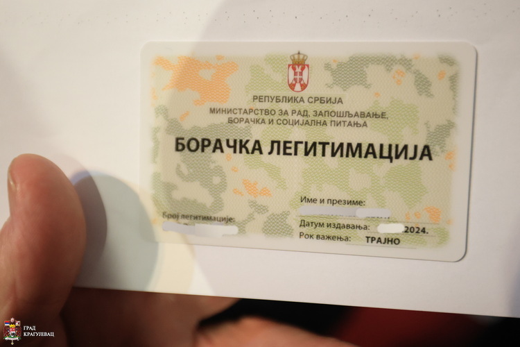 Државни секретар у Министарству за рад, запошљавање, борачка и социјална питања, Дејан Антић и градоначелник Никола Дашић, у сали Скупштине града Крагујевца данас су борцима са територије нашег града свечано уручили борачке легитимације.