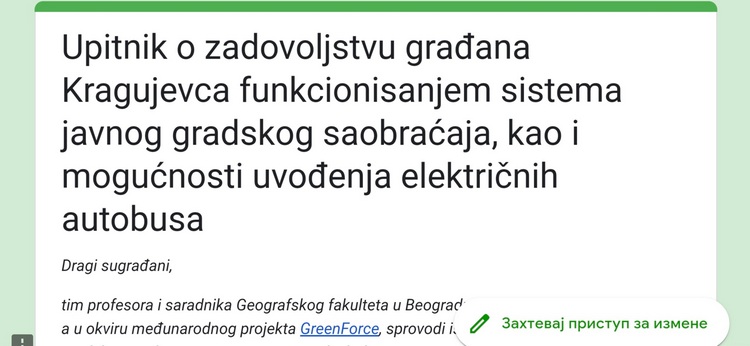 У оквиру међународног пројекта GreenForce тим професора и сарадника Географског факултета у Београду уз подршку Града Крагујевца, спроводи истраживање о коришћењу јавног градског саобраћаја у Крагујевцу а у циљу бољег разумевања аспеката који су грађанима важни, као и мерења степена њиховог задовољства тренутним стањем система јавног градског саобраћаја.