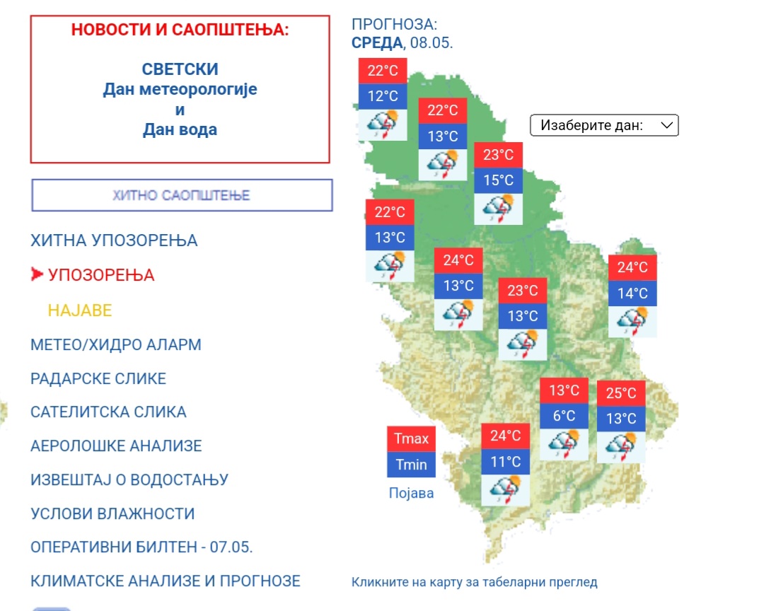 Републички хидрометеоролошки завод проследио је градском Штабу за ванредне ситуације упозорење за подручје Србије на обилне пљускове са грмљавином и појаву града, а локално и великом количином падавина за кратко време (већом од 20 мм за 3 часа) у среду и четвртак, 8. и 9. маја.